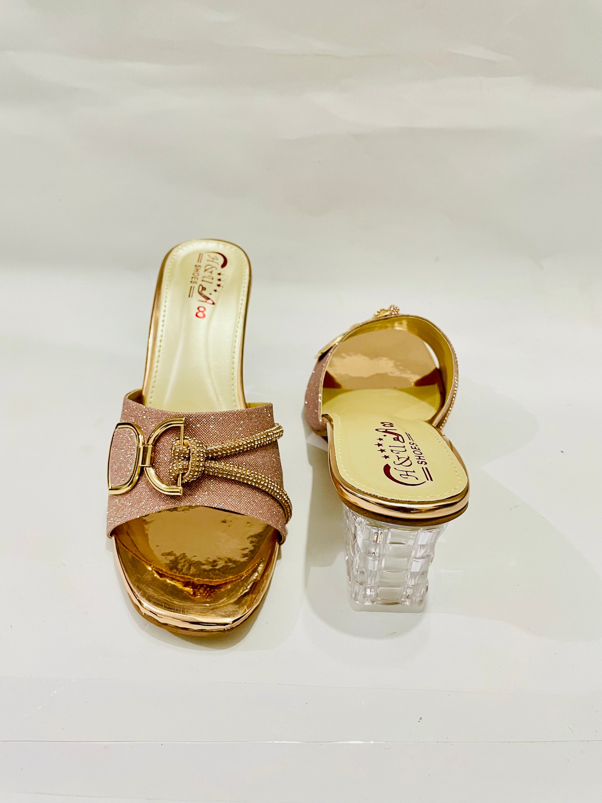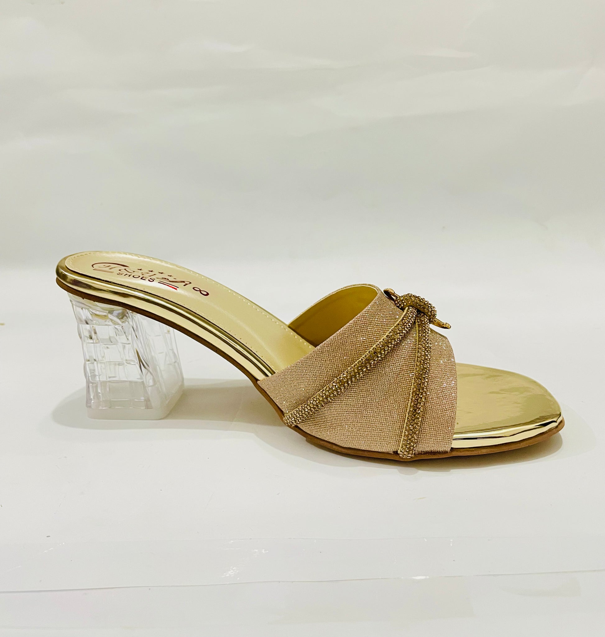 Step into elegance with our Golden Grace Block Heels, designed for women who love comfort without compromising on style. Featuring a shimmering golden strap embellished with delicate bead detailing, these slip-on heels add a glamorous touch to any outfit. The transparent block heel not only provides sturdy support but also a modern, chic look. Perfect for parties, weddings, and festive gatherings, these sandals are your go-to choice for making a lasting impression.
